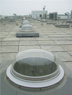 頂層安裝尤為適用于單層或頂層建筑。挺立的采光罩不管風吹雨打、日曬雨淋,依舊“賣力”地采光,為建筑內部提供源源不斷的太陽光。猶如一個個勇士站列頂層,為建筑保駕護航,帶來光明。