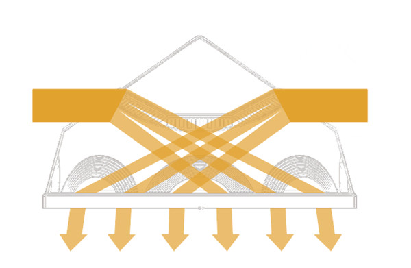 不僅使上午及下午陽光轉(zhuǎn)向?qū)?,還對光線進(jìn)行聚焦,提高采光效率